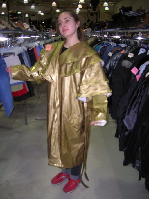 Things I hope find a home, though not with me: an alligator skull, a stack of watercolors all painted by the same moderately talented but clearly dedicated amateur artist, what appeared to be the World's Ugliest Kimono (with matching... shawl thingy!), and, the crowning glory, this. The photo really, really doesn't do it justice; I think parts of it were *holographic,* for the love of god. I... the closest I can come to capturing it in words is to say that it might be what gay samurai will wear in the distant future, when they go on long space journeys.