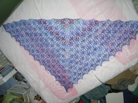 I FINALLY finished Flower Basket #2! Like most lace, it looked scrunchy and weird off the needles, but once I blocked it? So pretty! It's *huge*, too-- that's a queen-sized bed it's pinned out on, and I had to lay it out diagonally to get it to fit.